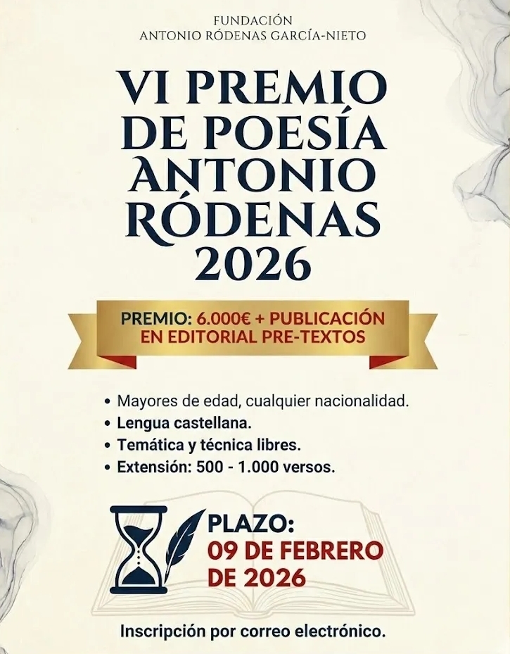 El Patronato de la Fundación Antonio Ródenas García-Nieto convoca el ‘VI Premio de Poesía Antonio Ródenas 2026’. Podrán participar los poetas mayores de edad, sea cual fuere su nacionalidad. Las obras han de presentarse en lengua castellana.